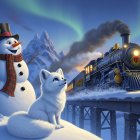 A cheerful snowman in a scarf and a cute white fox watch the Polar Express train, adorned for the holidays, puffing through a snowy landscape under the glow of the northern lights.