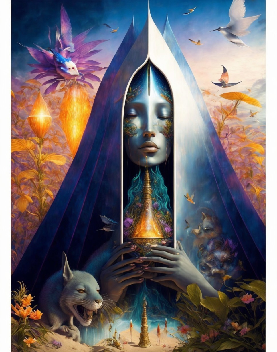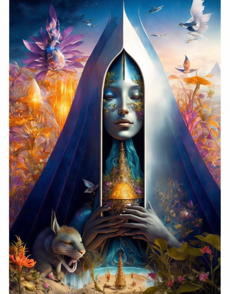 A surreal artwork depicting, a face of a woman holding a goblet of fire, within a giant flower-like structure, surrounded by vibrant flora, and fauna.