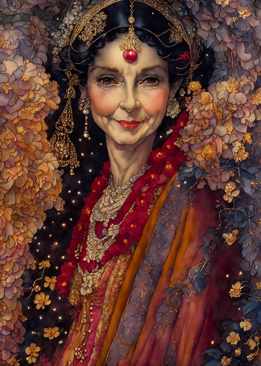 A charming elderly woman smiles warmly amidst a bouquet of vibrant flowers. She wears intricate jewelry and a colorful shawl, exuding grace and timeless beauty in a cozy, floral-filled setting.