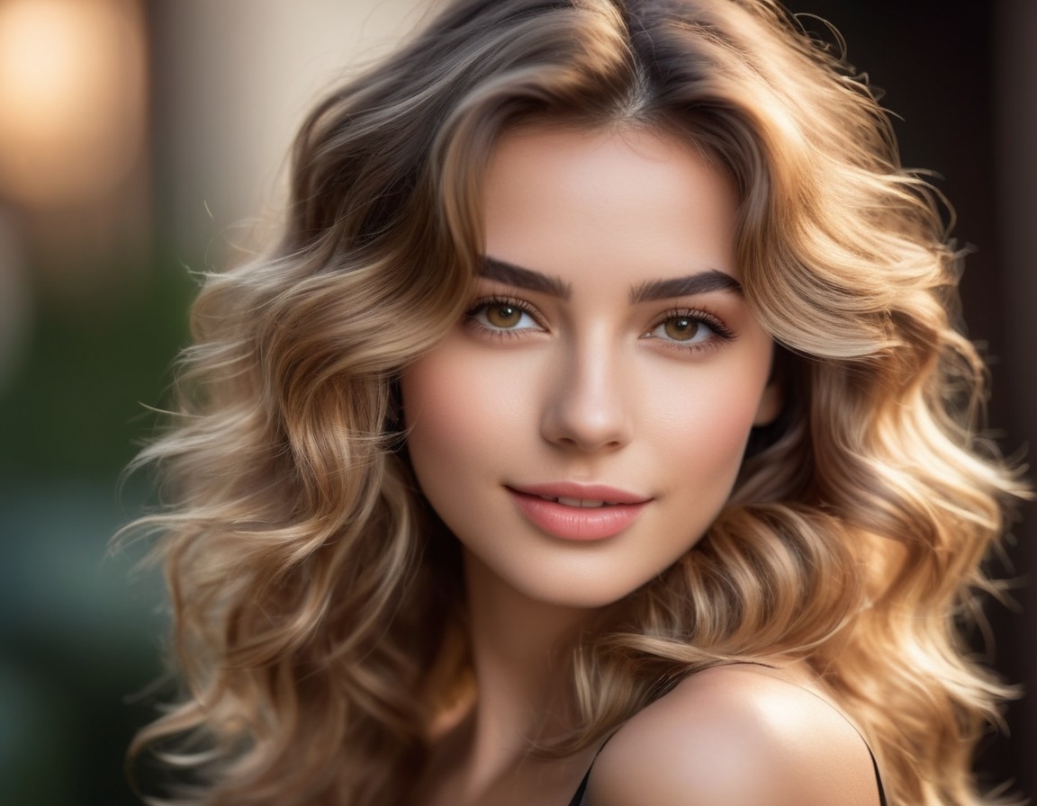 A portrait of a woman with curly blonde hair, green eyes, and a fair complexion, captured with a soft-focus background.