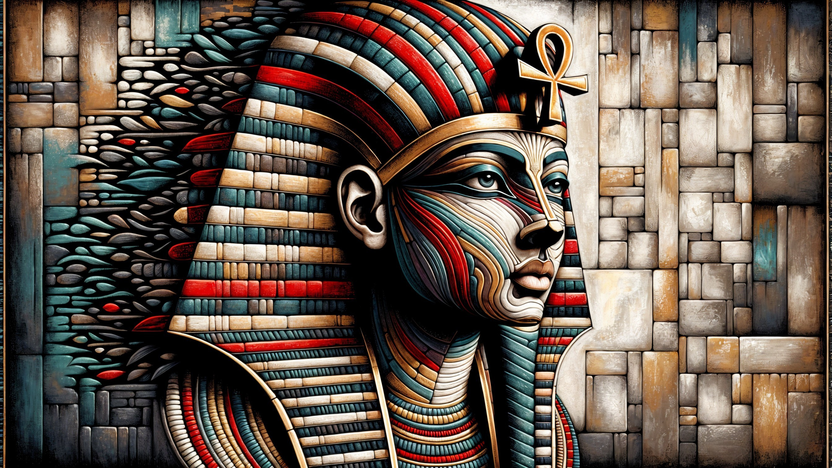 This artwork features a colorful, abstract portrayal of an ancient Egyptian figure, adorned with a pharaoh's headdress and ankh symbol, set against a textured geometric background.