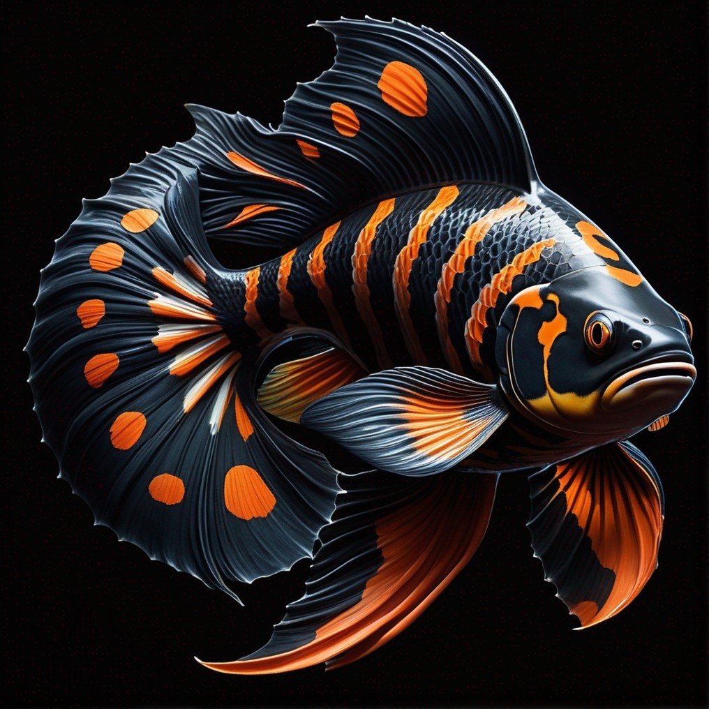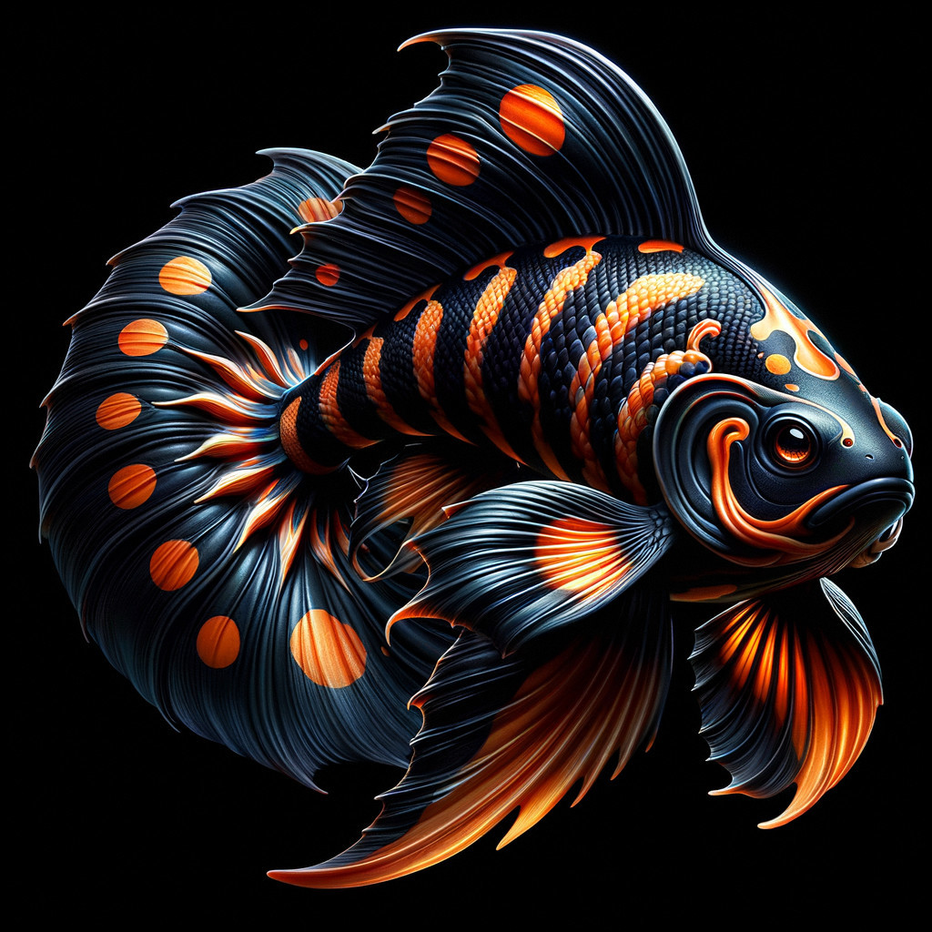 A vibrant digital artwork of a betta fish with striking orange and black stripes and spots against a dark background.