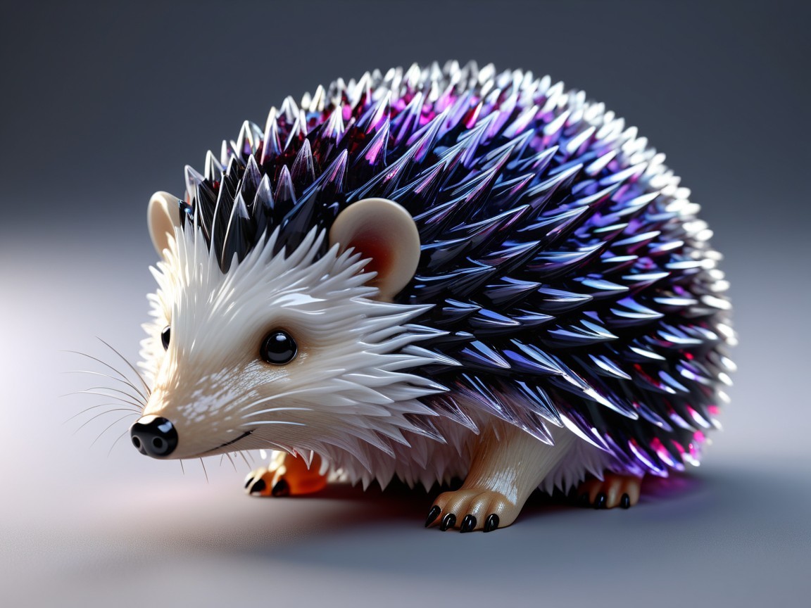 A whimsical, stylized hedgehog figurine with a shiny, metallic, and iridescent quilled back. The hedgehog’s head and underside are smooth, cream-colored, and glossy, complementing its small, dark, expressive eyes and tiny black nose. Its quills are sharp and spiky, transitioning from silver