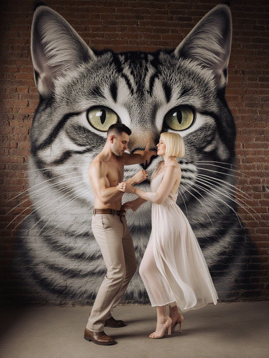 A striking scene features a couple in elegant outfits, with a large, captivating mural of a cat's face in the background. The interplay between the figures and the artwork creates a surreal atmosphere.