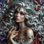 A stunning figure with wavy silver hair adorned with vibrant butterflies. Her captivating makeup highlights her features, while jewel-toned accessories add to the ethereal, enchanting atmosphere.