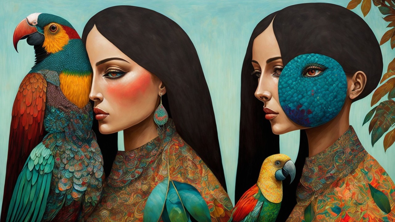 The artwork features a woman and a parrot in a vibrant tropical setting, showcasing a harmonious exchange between nature and humanity, with rich colors and intricate patterns enhancing the scene.