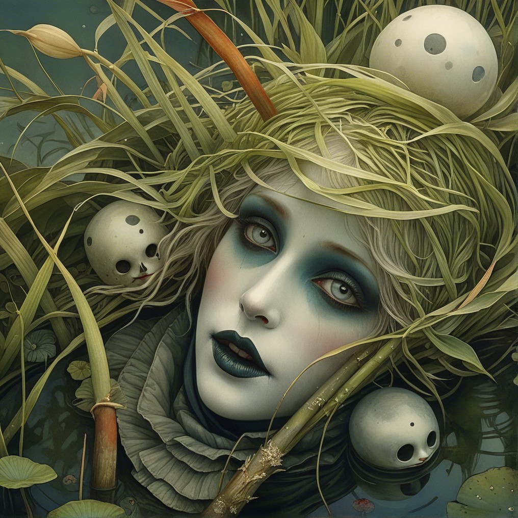 A mystical figure emerges from a serene pond, surrounded by lily pads. With pale skin, dramatic makeup, and a crown of greenery, she exudes an enchanting, otherworldly presence.