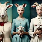A woman in a vintage dress stands amidst stylized sheep and dogs, blending elements of fashion and nature in a surreal, artistic composition. The scene has a striking, enchanting quality.