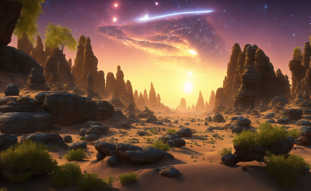 Extraterrestrial desert landscape: Sunset, rock formations, sun, comet