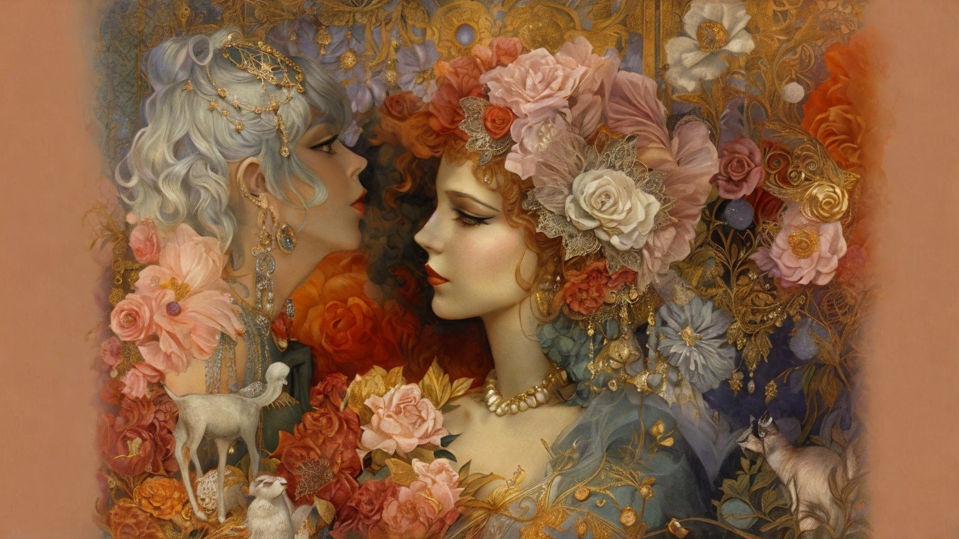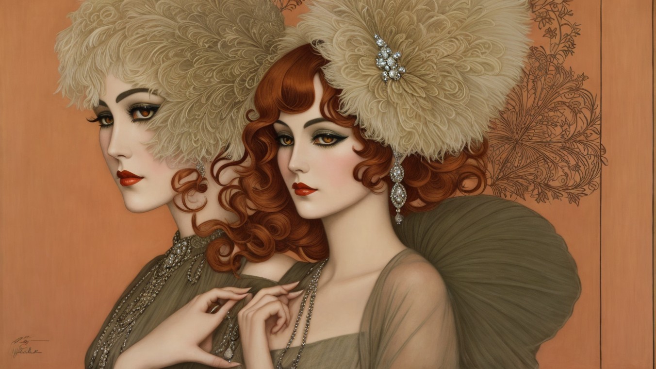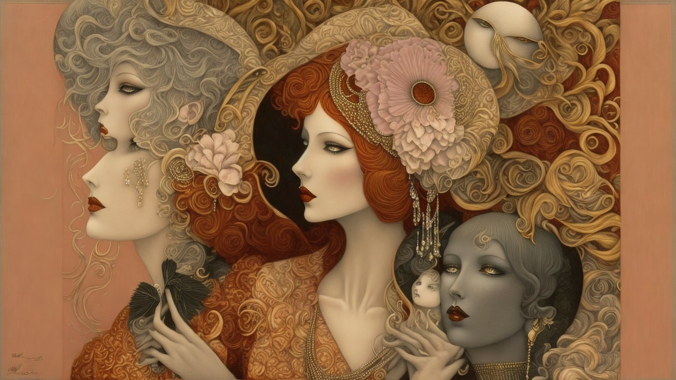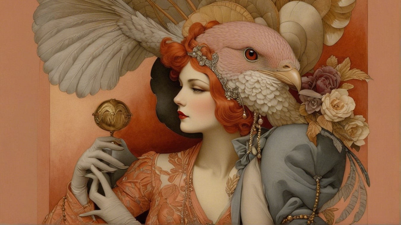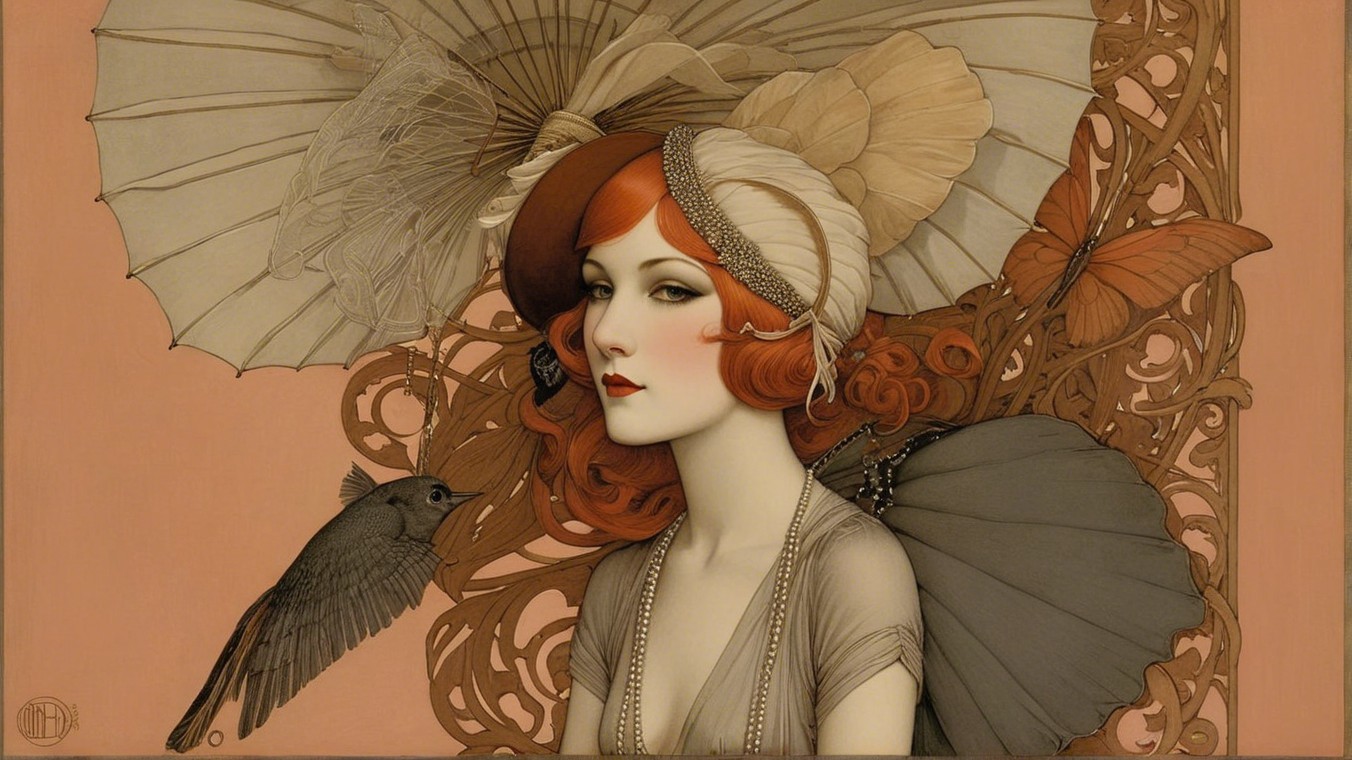 A graceful, stylized woman with red curls and a delicate hat gazes serenely. She is adorned with elegant accessories and a parasol, surrounded by intricate floral patterns and a butterfly.