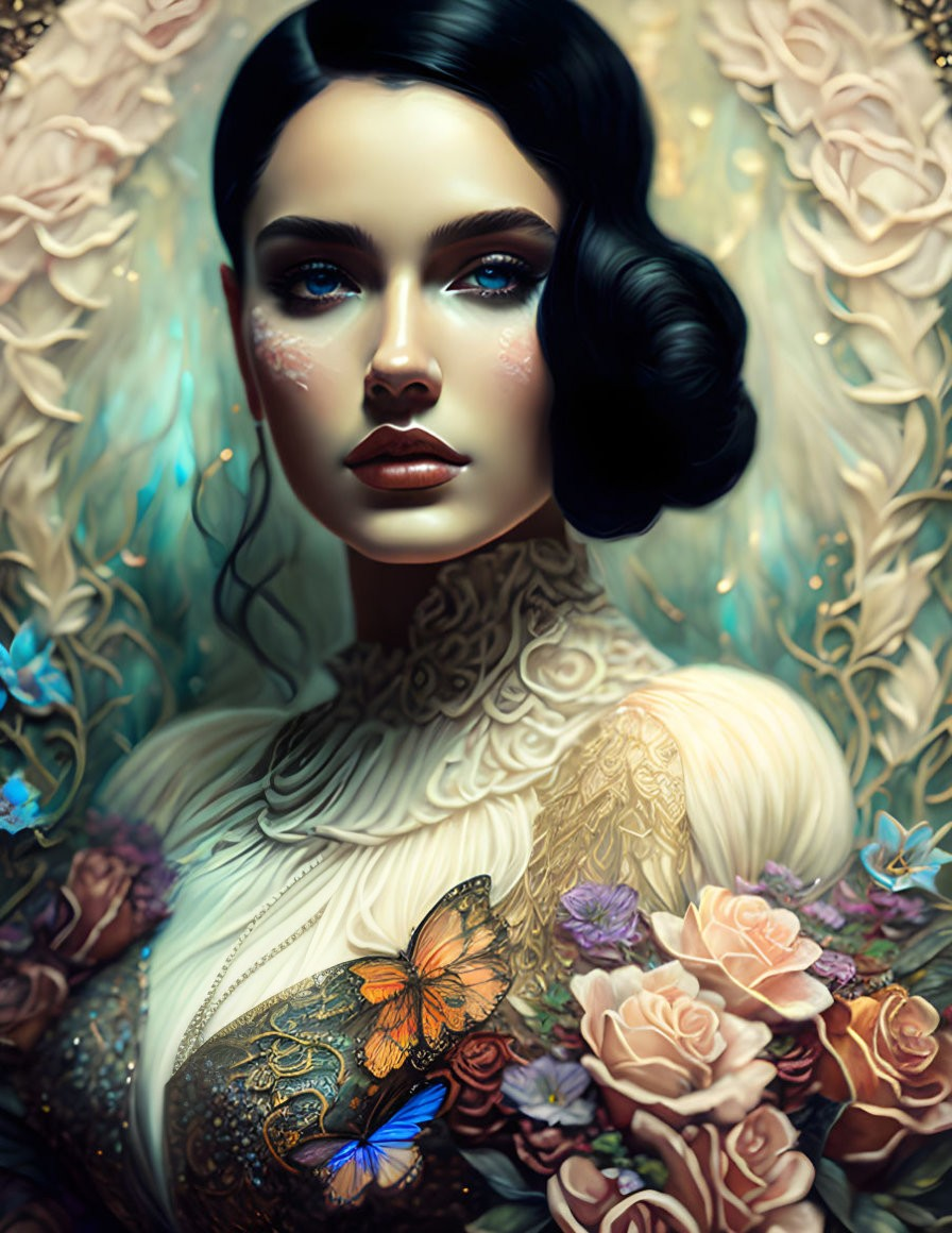 Portrait of a woman with dark hair, surrounded by flowers and a butterfly, with a detailed, ethereal aesthetic.