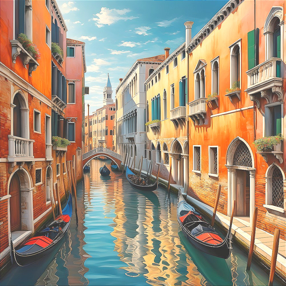 A picturesque Venetian canal lined with brightly colored buildings. Gondolas float gently on the water, and a charming bridge arches over the scene under a clear blue sky.