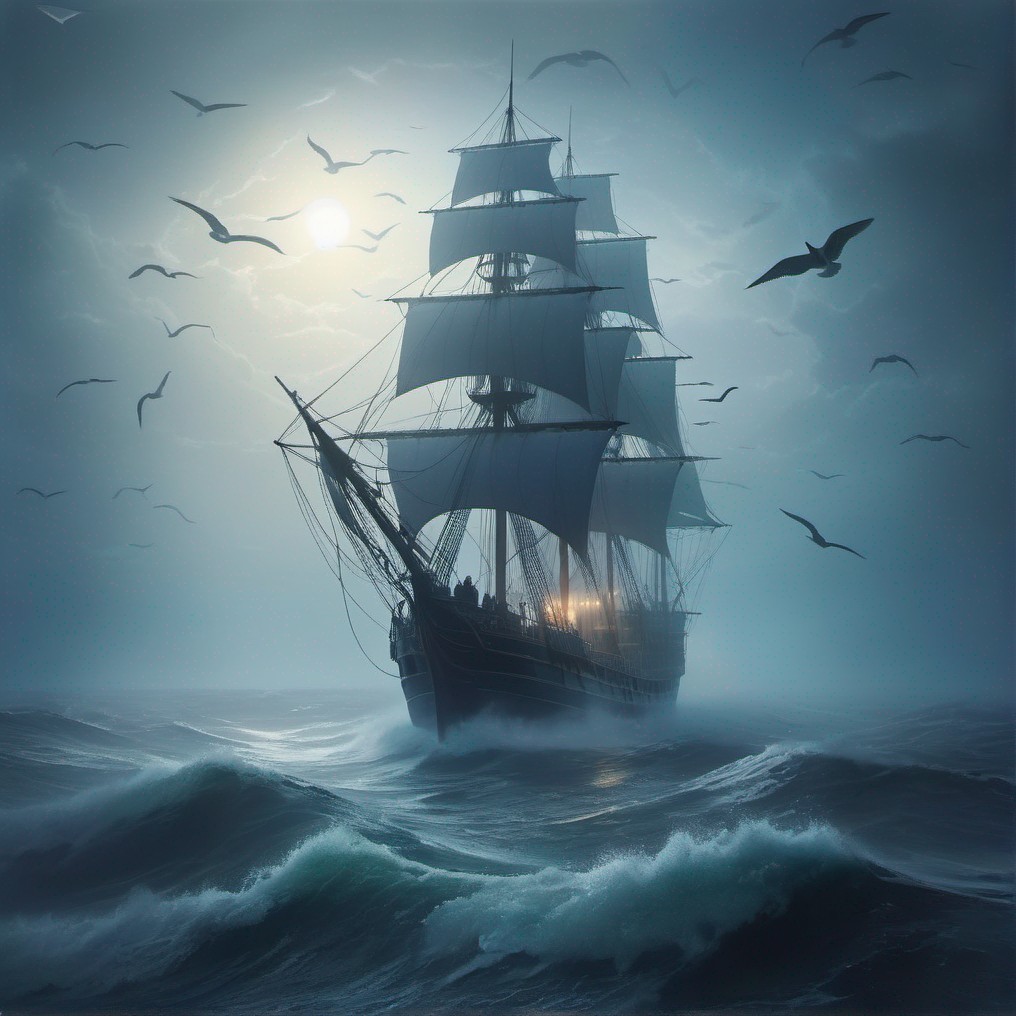 Prompt: Amidst the swirling mists of an early dawn, a solitary ship, her sails billowed by the ghostly breath of the sea, cuts a path through the azure embrace of the ocean. On her deck, men of hardy countenance and salt-crisped hair move with the rhythm of the waves, their eyes alight with the thrill of adventure and the promise of undiscovered lands. Above them, the gulls wheel and cry, the eternal heralds of the deep's mysteries and the keepers of its secrets, as the sun's first rays lance through the fog, setting the world ablaze with gold.