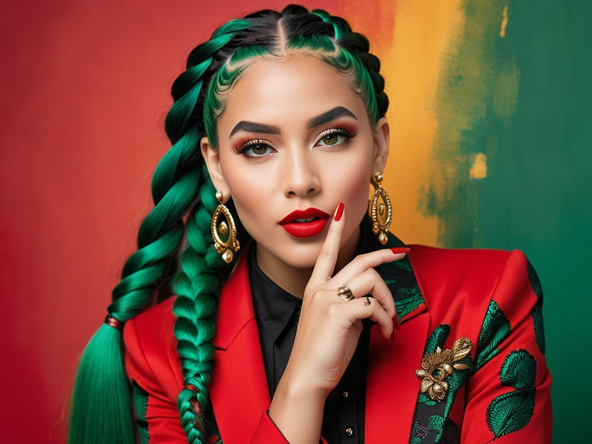 A striking portrait of a woman with vibrant green hair styled in braids. She wears a red blazer adorned with floral designs, bold makeup with green and red hues, and elegant earrings, exuding confidence.