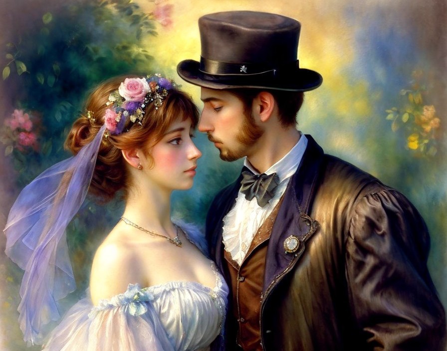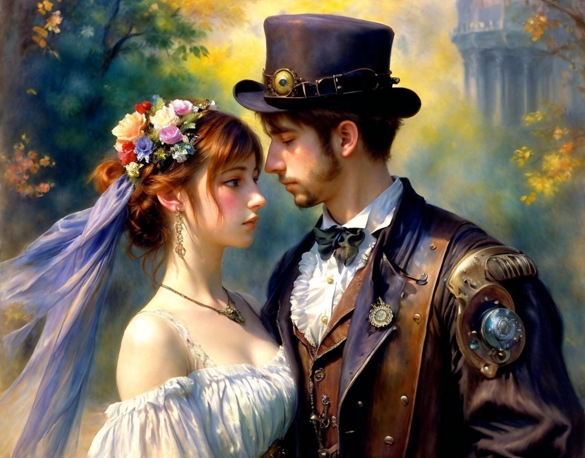 Prompt: "Magical impressionism, portrait of a beautiful steampunk couple. Impressionism with a touch of magic. Aquarelle, dreamlike, subtle and delicate."