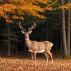 Prompt: "A deer with brown antlers like tree branches, with Autumn leaves hanging on them. The deer is brown with white splotches, and the back ground is a deep forest in the fall. it is day"