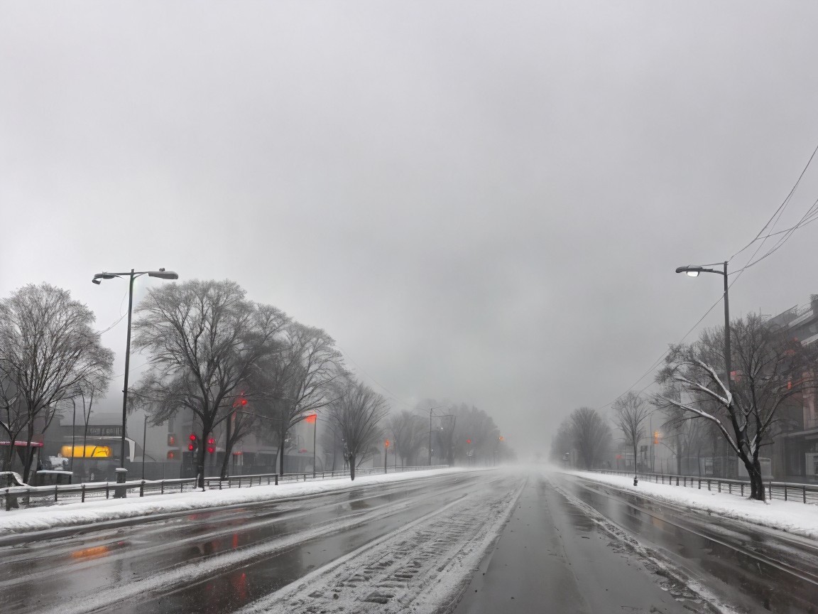 A snowy street scene shrouded in fog, with buildings lining both sides. Streetlights glow softly, illuminating the white landscape and reflecting on the wet pavement. The atmosphere is quiet and serene.