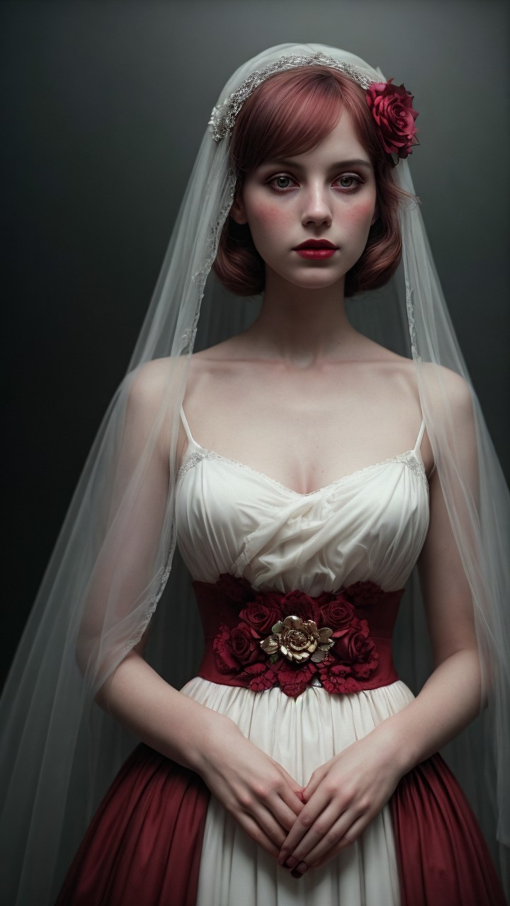 A bride in a stunning gown featuring a fitted red waist and flowing white skirt, with a delicate veil and floral accents in her hair. She exudes elegance and a hint of mystery.