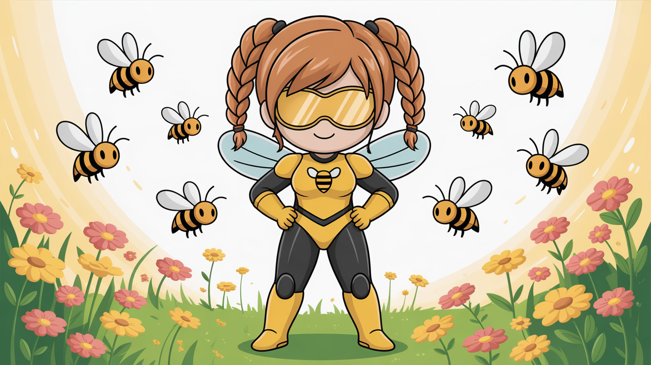 A charming anime beekeeper superheroine dons a vibrant outfit adorned with bee motifs. She skillfully protects nature and promotes environmental harmony while showcasing her love for bees and adventure.