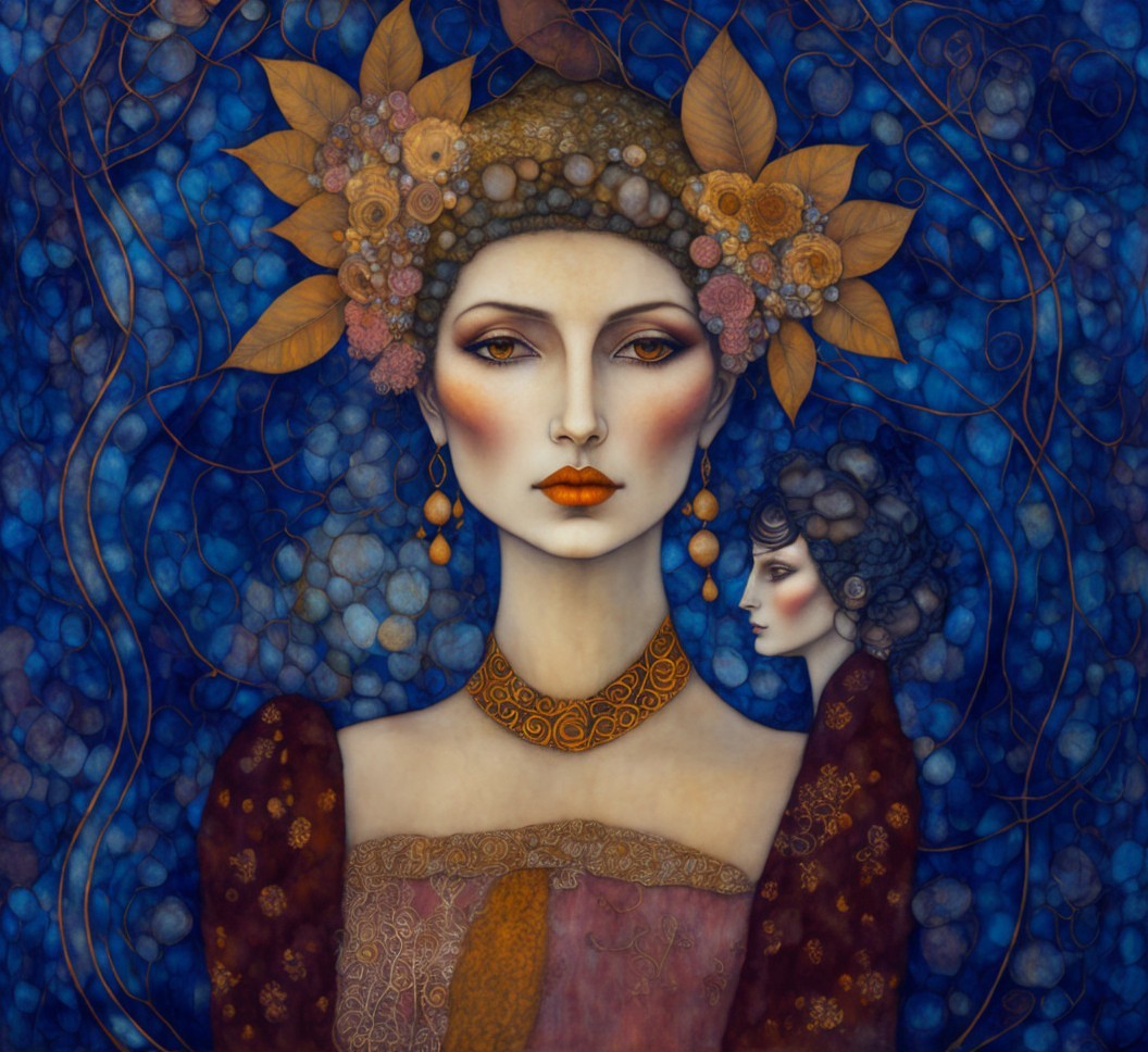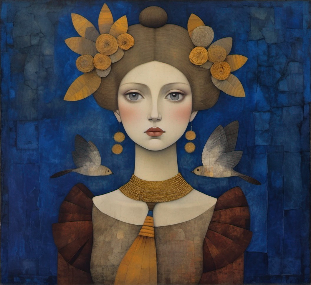 Beautiful woman with a beehive hairdo, portrait in ochre, patina of ancient stone with moss, art brut, moody, somber, desaturated colors, in the style of Paul Klee, Arthur Rackham