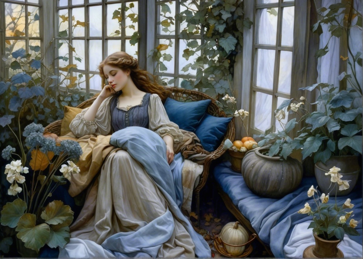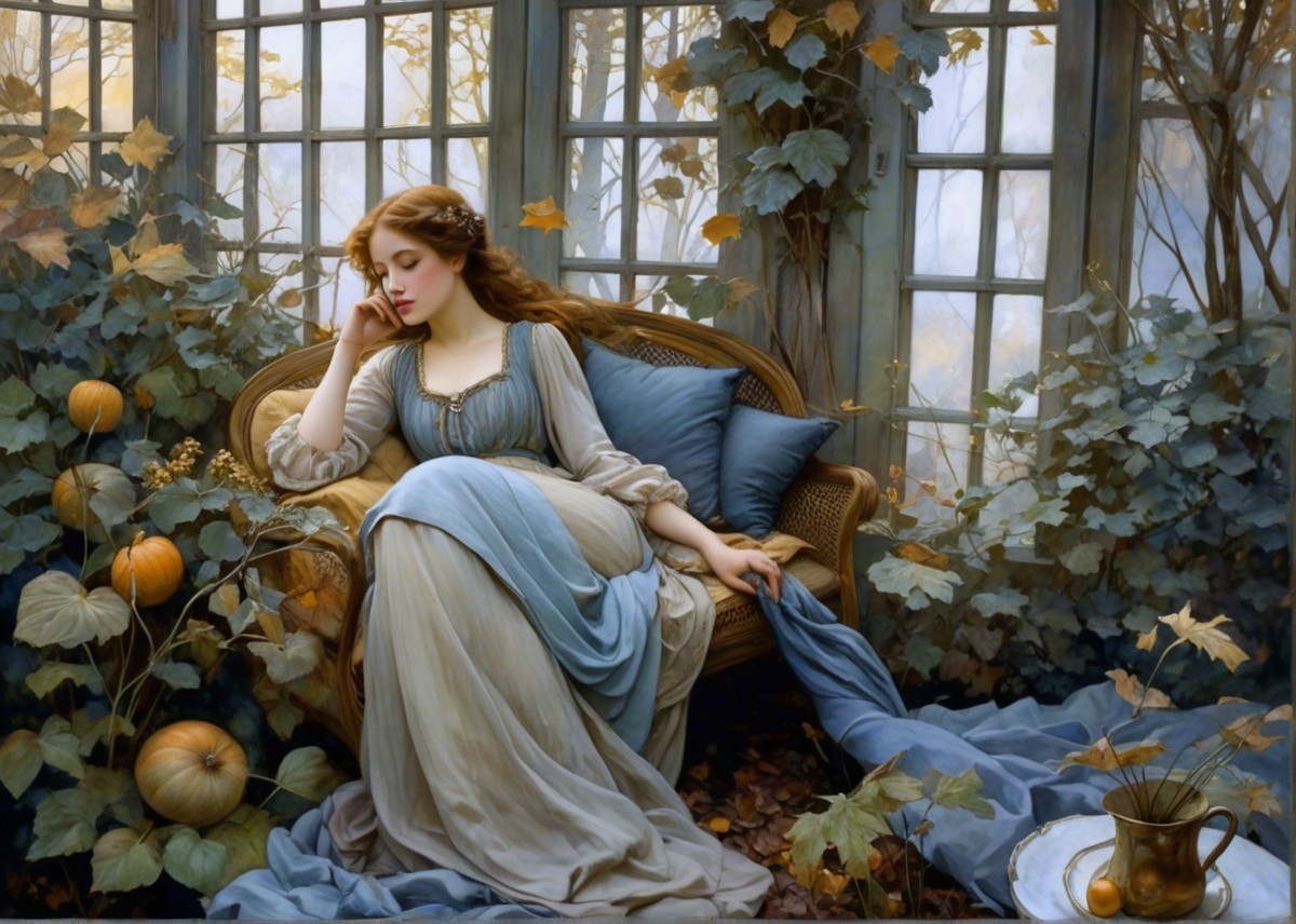 A serene woman in a flowing blue dress reads in a sunlit garden with autumn leaves. A pumpkin and oranges adorn her surroundings, creating a tranquil, romantic atmosphere.