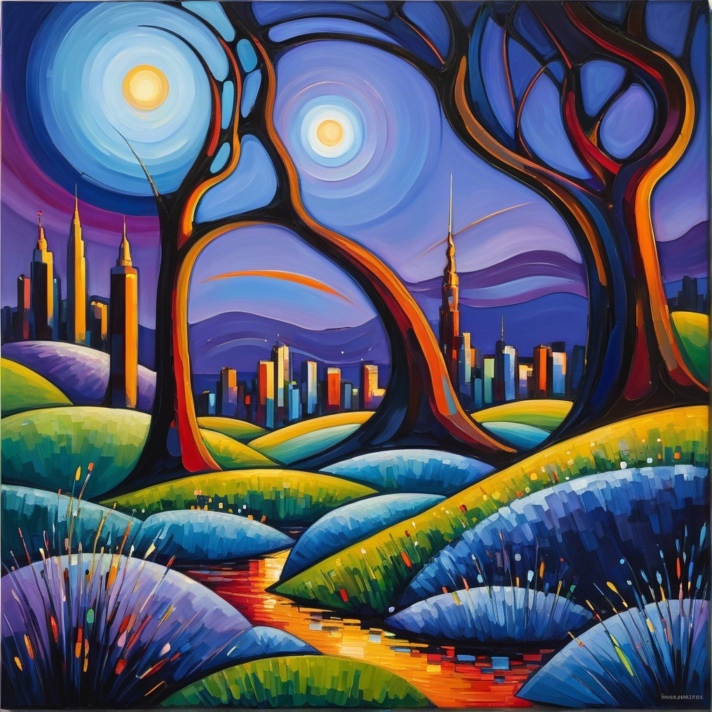 A vibrant, colorful landscape features abstract trees and rolling hills under a night sky. A city skyline glows in the background, reflecting on a serene water surface, creating a whimsical atmosphere.