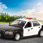 A classic black and white 1998 Ford LTD Crown Victoria Police Interceptor car with a shiny finish, equipped with a light bar on top. The vehicle is parked in an open area under a bright blue sky with fluffy clouds.
