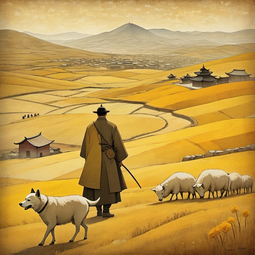 A lone figure in a hat and coat stands with a cane, gazing at a pastoral landscape with rolling hills, grazing cattle, and quaint buildings.