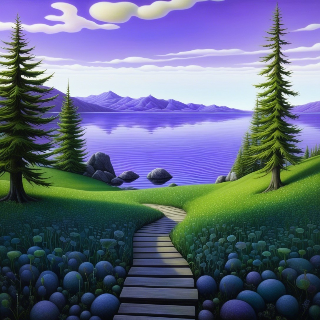 A serene landscape features a winding path leading towards a tranquil lake, surrounded by lush green hills and tall evergreen trees, with purple mountains and soft clouds in the sky.