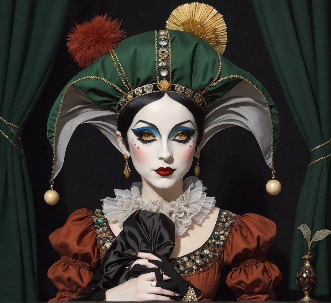 A painting depicts a stylized woman in a harlequin costume with a black cat, characterized by dramatic makeup and vintage fashion elements.