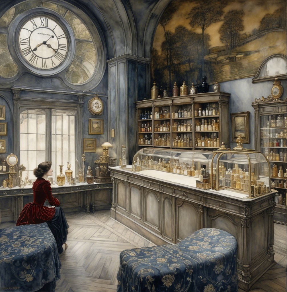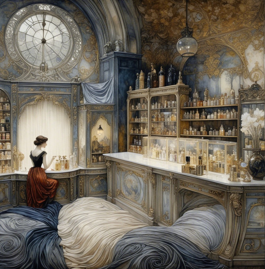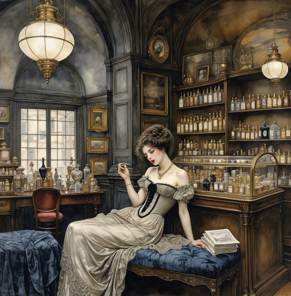 A glamorous woman in a silver gown leans against a wooden counter in an elegant vintage apothecary. The room is filled with glass bottles and ornate decor, exuding a timeless, classy atmosphere.