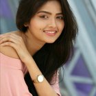 A woman with long, flowing hair poses elegantly, wearing a soft pink off-the-shoulder top. She smiles gently, accessorized with simple earrings and a bracelet, radiating warmth and beauty.
