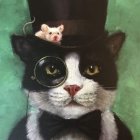 A dapper cat wears a black top hat adorned with a pink rose, round glasses, and a bow tie, exuding a charming, sophisticated vibe against a soft green background.