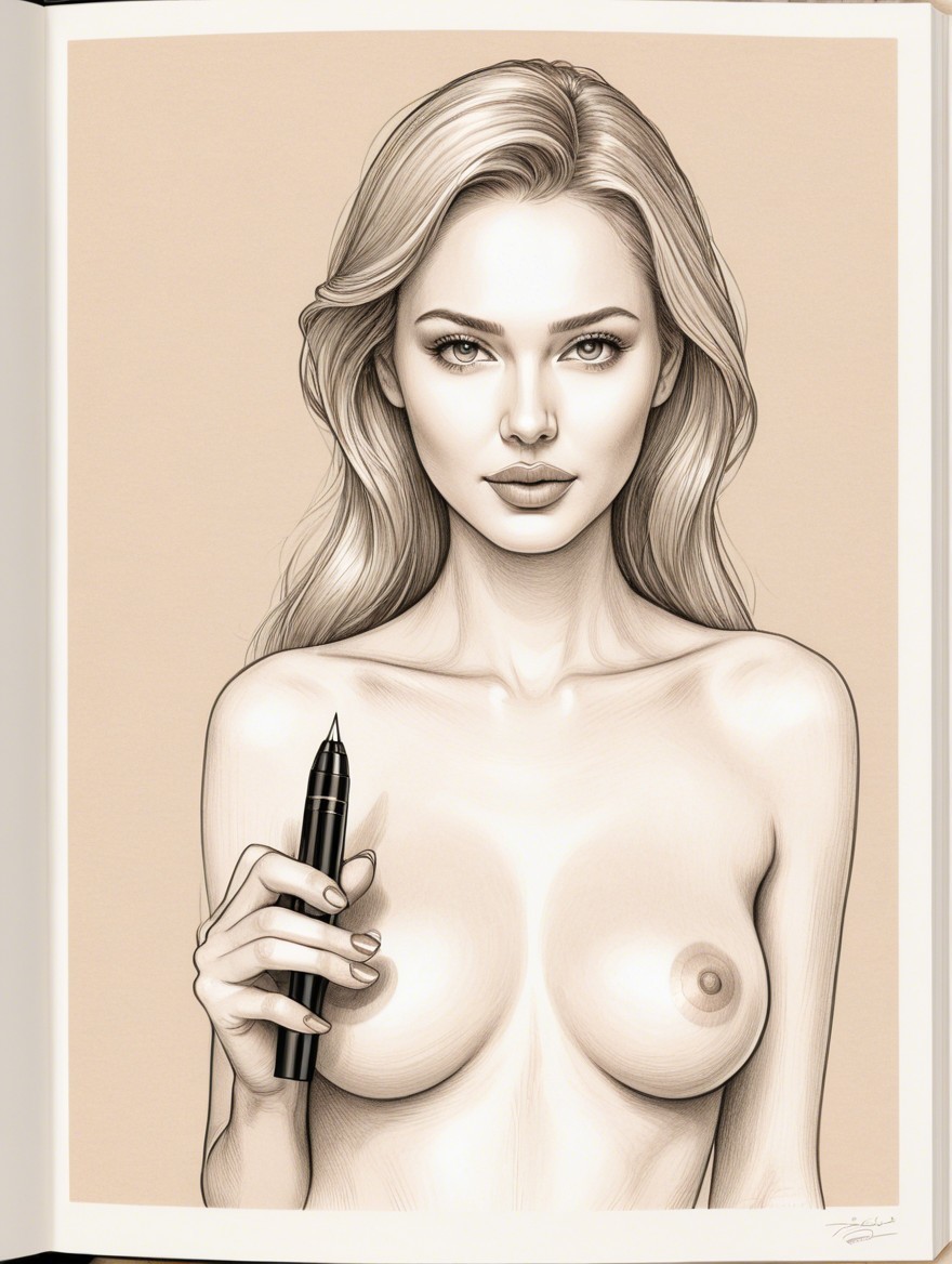 A stunning, monochromatic portrait of a woman with long, flowing hair. She poses with a finger to her lips, exuding a sense of intrigue and allure against a simple background.
