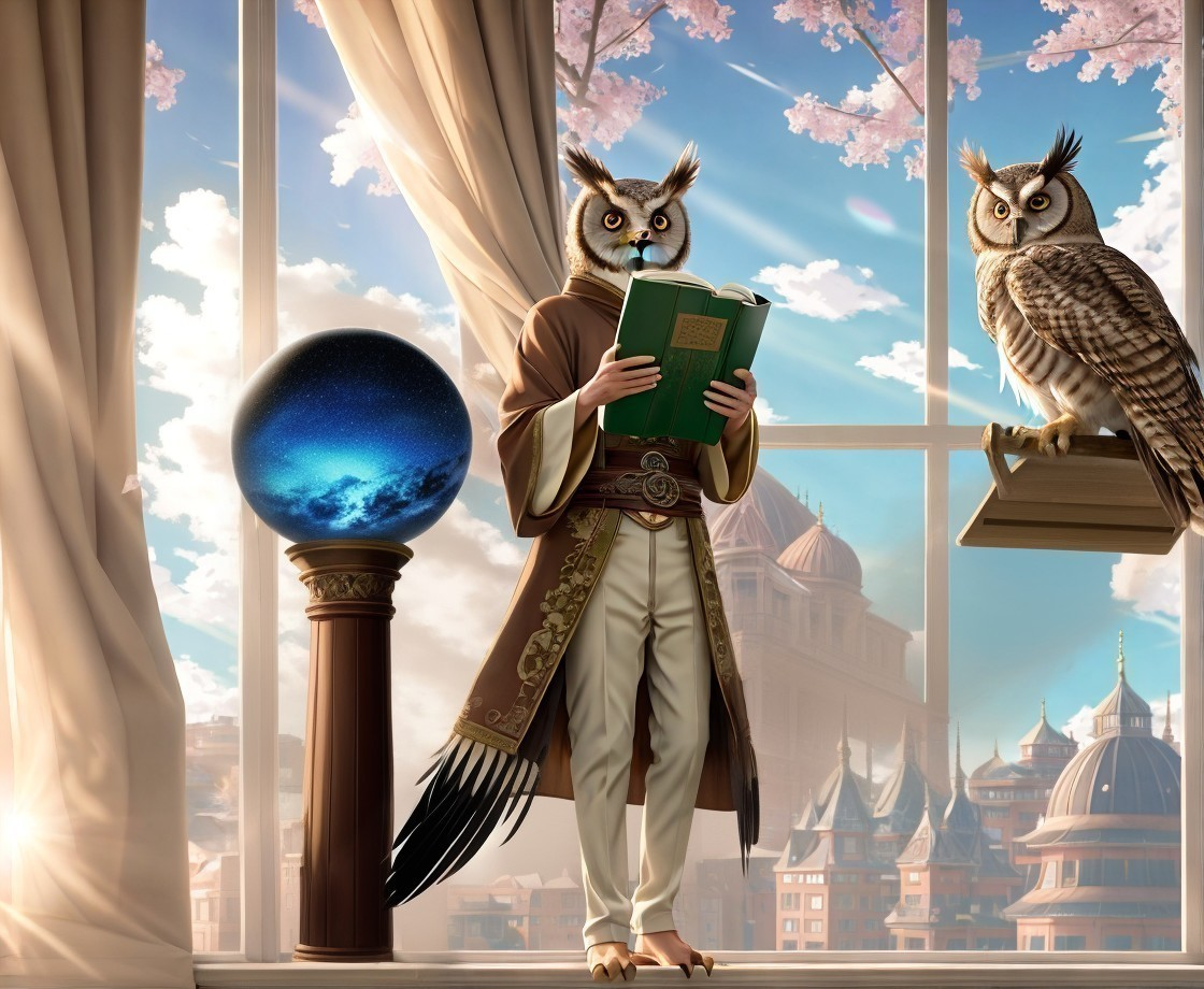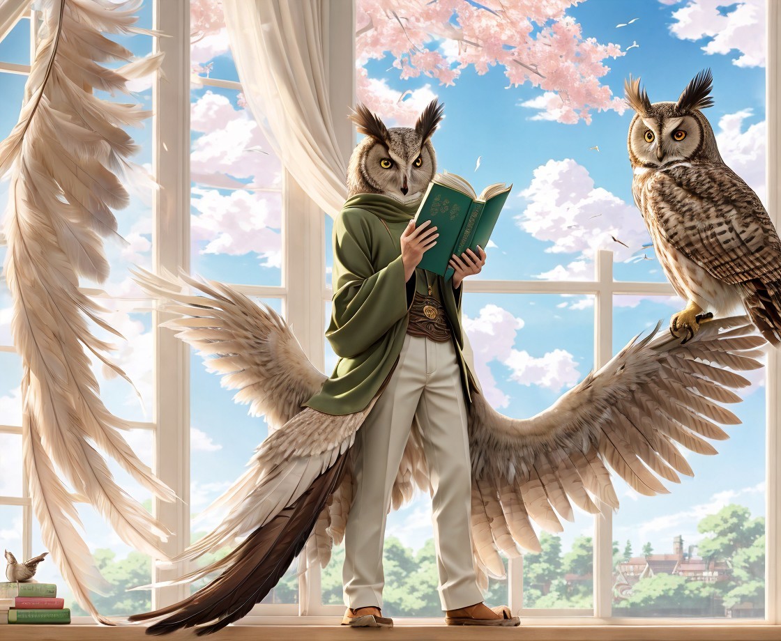 An anthropomorphic owl reading a book beside a window, with a real owl on the sill, overlooking a cityscape with cherry blossoms.