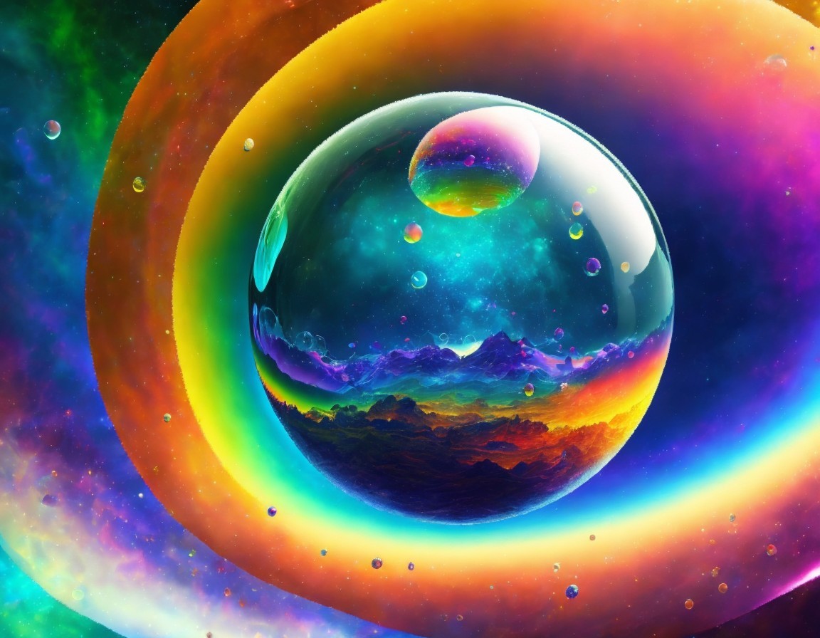 A vibrant image showcasing a large, central bubble with a letter "E" overlaid, surrounded by smaller bubbles against a colorful, cosmic background.
