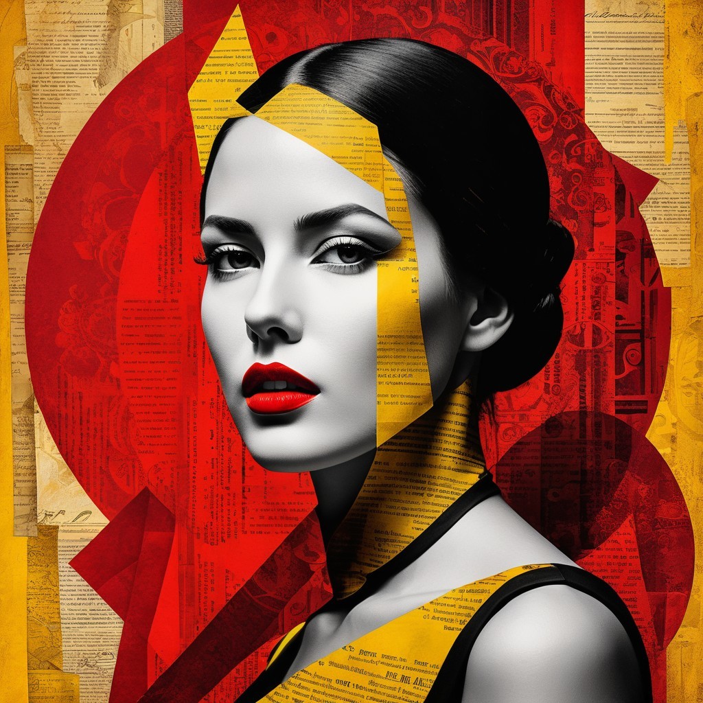 The image features a striking woman with dark hair and bold red lips, adorned with intricate gold patterns and floral accents, set against a vibrant red and gold background. Appreciation to NAHORAI for the use of the prompt.