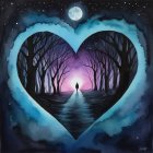 A winter landscape featuring a snow-covered forest pathway and tall, slender, bare trees silhouetted against a bright sun in the center, casting long, dark shadows across the pristine white snow. The sky is a gradient of light to dark blue, with the brightest point directly behind the sun