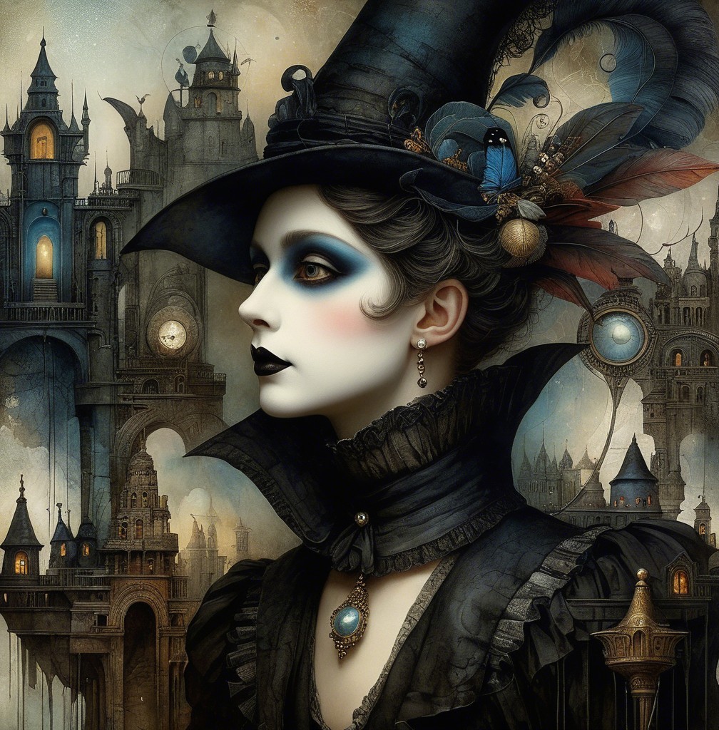 A striking figure in a tall black hat and ornate attire stands against a fantastical castle backdrop. Their face is painted white, with dramatic blue and red accents, exuding a mysterious elegance.
