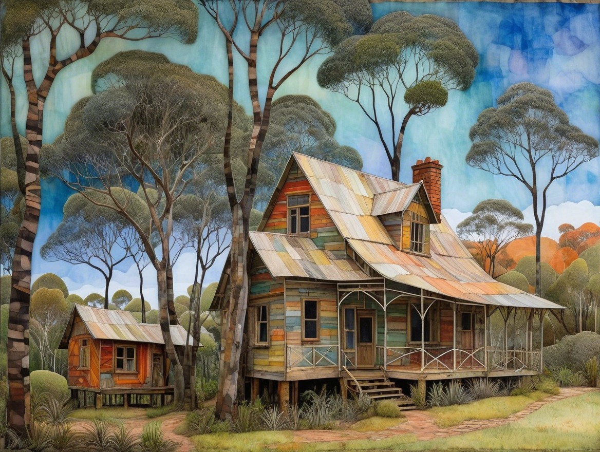 The image features whimsical, stained-glass-style houses nestled among intricate trees. The vibrant colors and flowing lines create a dreamy, enchanting forest scene.