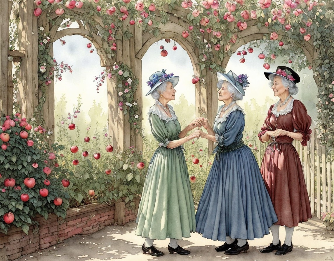 Two women in period clothing laugh and pick apples in an idyllic orchard, with quaint cottages in the background.