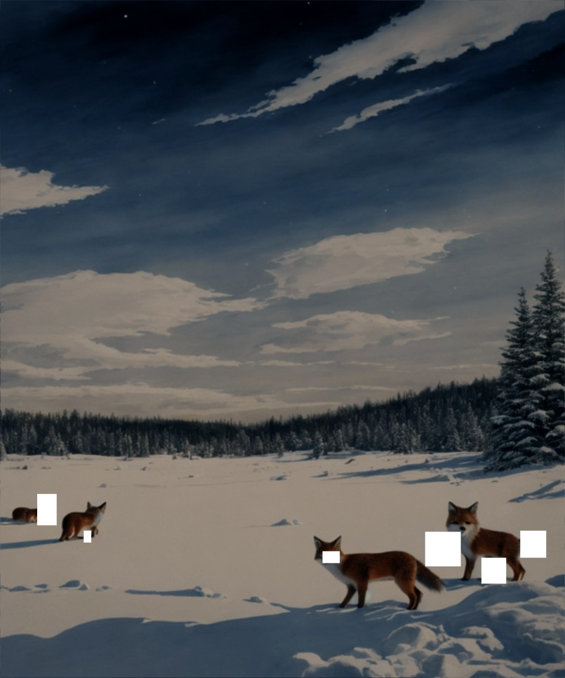A serene winter scene features a group of foxes traversing a snowy landscape. The sky is dotted with clouds and stars, while mountains rise in the distance, creating a peaceful atmosphere.