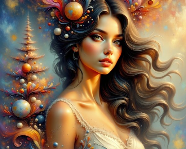 A close-up portrait of a woman with flowing hair, surrounded by vibrant butterflies in shades of orange and blue. Her flawless skin and serene expression create a captivating, dreamy atmosphere.
