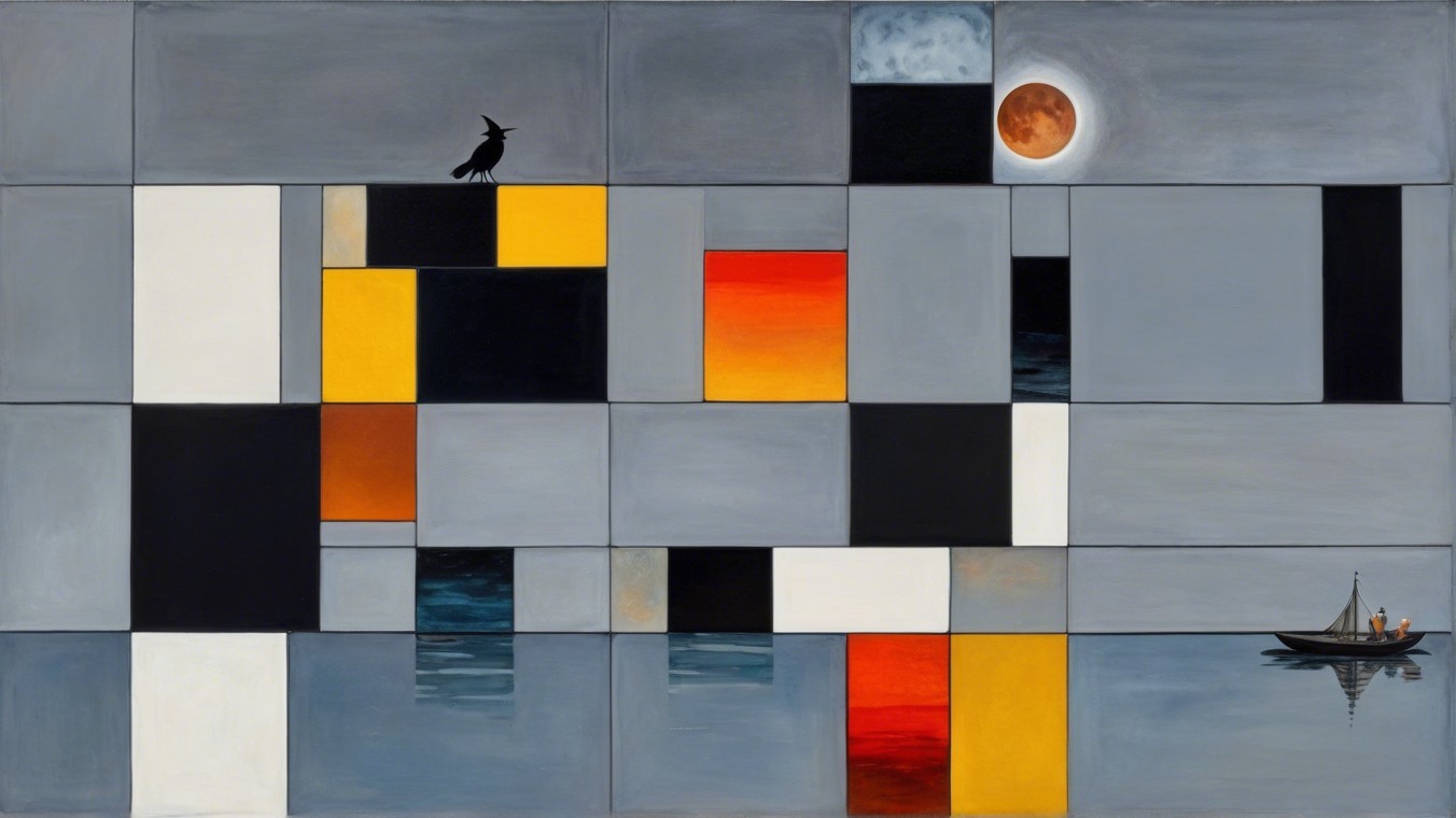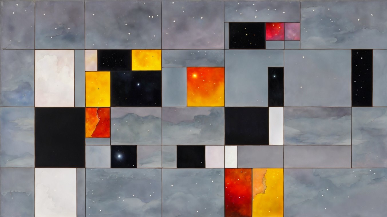 The artwork features a mosaic of colorful panels depicting landscapes, night skies, and celestial elements. Varying shades of blue, orange, and gray create a serene, contemplative atmosphere.
