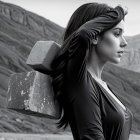 A stylized, monochromatic figure appears to be emerging from abstract rock formations. The character is angular and dynamic, set against a backdrop of rugged, geometrically shaped mountains.