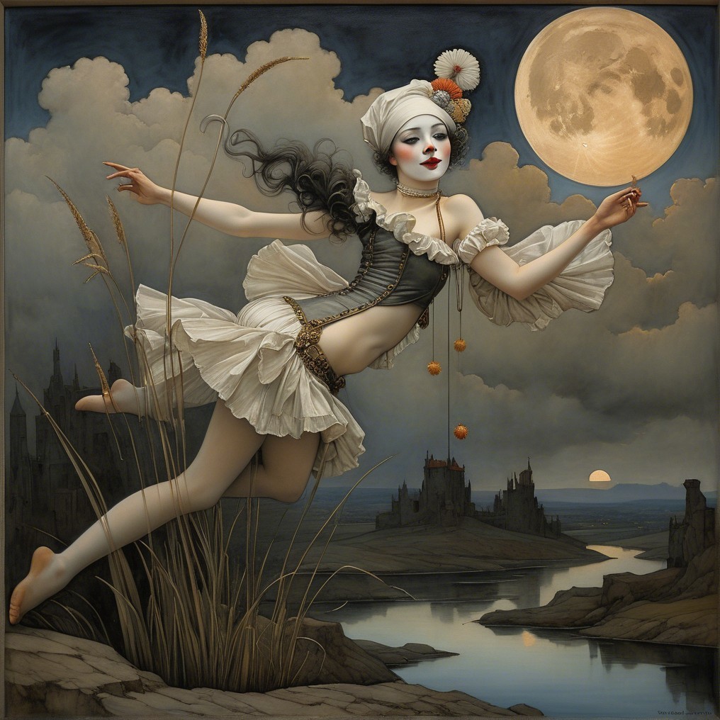 A whimsical figure in a lavish dress holds oversized balloons against a surreal landscape, blending elegance with fantasy. Mystical moons illuminate a serene background of mountains and water.