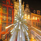 A very tall opulent green Christmas tree stands in the center of a wide outdoor plaza or street, adorned with numerous small twinkling yellow lights and large, dazzling starburst decorations. A bright, spiky star ornament crowns the top of the tree, which is enclosed by a circular fence made of vertical golden light