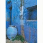 Two vibrant birds perch on a pot with a small plant, set against a striking blue wall. The scene captures a tranquil and colorful moment in nature, framed by soft natural light.