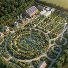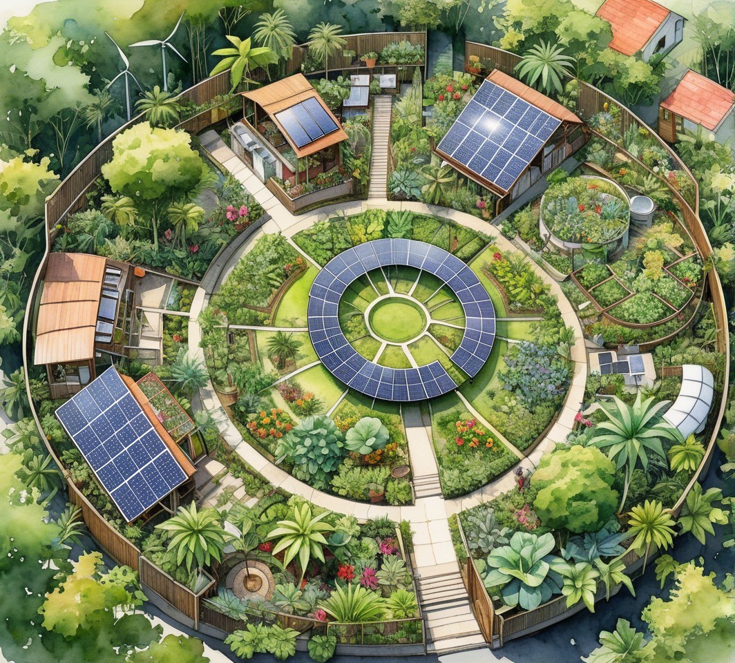 + Prompt:ink and watercolor birds-eye-view of a circular tropical community garden. around the perimeter of the garden are many solarpunk houses with solar panels and water catchment systems.
