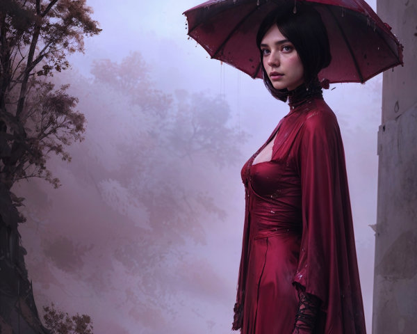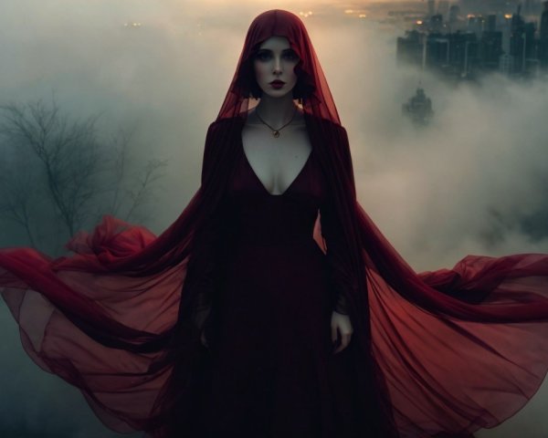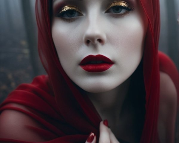 A striking woman with pale skin and bold red lips wears a sheer red hood in a misty forest. Her dramatic eye makeup features glimmering gold accents, enhancing the mysterious ambiance.
